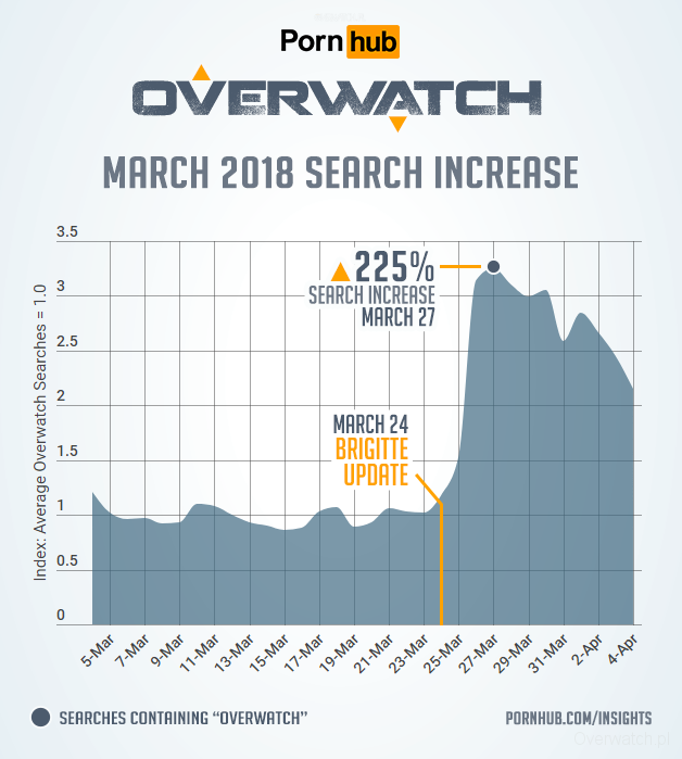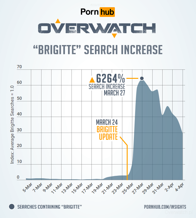 Bo dawno nic o tym nie było. Spokojnie, to nie powrót do przeszłości i shitowego contentu, ale to zawsze wywołuje spore emocje i nie mogłem przejść obok tego obojętnie. Potraktujcie to jako ciekawostkę, bez spinania!Overwatch był 13 najczęściej wyszukiwanym hasłem na Pornhub w 2017 roku. Co ciekawe, OW zajęło pierwsze miejsce w Brazylii i 2 w Rosji. Z końcem 2017, to D.Va, Łaska i Smuga były najcześciej wyszukiwanymi postaciami. W marcu 2018 wyszła Brigitte, która w bardzo krótkim czasie przebiła wszystkich bohaterów. W zaledwie 10 dni, postać wbiła 2 miliony wyszukań, co dało wzrost o 6264% pod hasłem Brigitte. Ludzie dosłownie oszaleli na punkcie ten bohaterki.