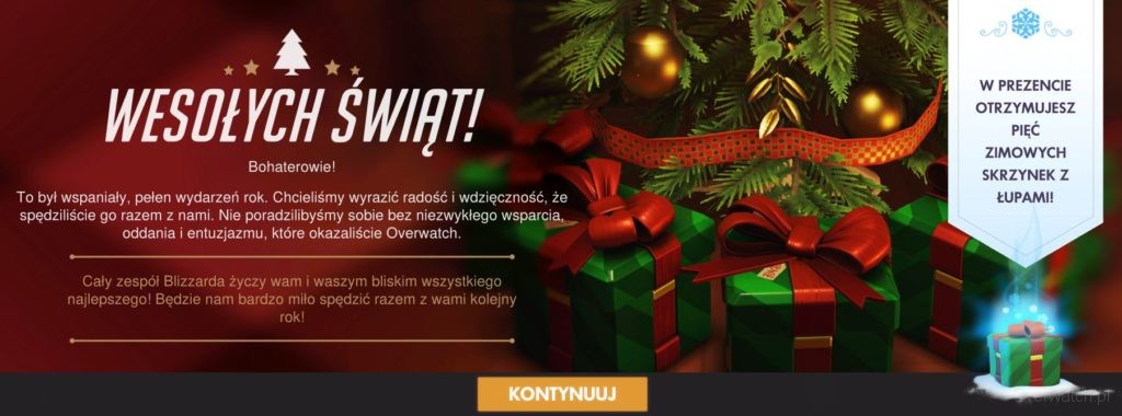 Blizzard każdemu dał 5 świątecznych skrzynek z łupami! Wystarczy zalogować się na swoje konto, darmowe skrzynki powinny być od razu dostępne! Jeżeli nie ma Was w domu to możecie zalogować się za kilka dni. Macie czas do końca wydarzenia, czyli 2 stycznia.