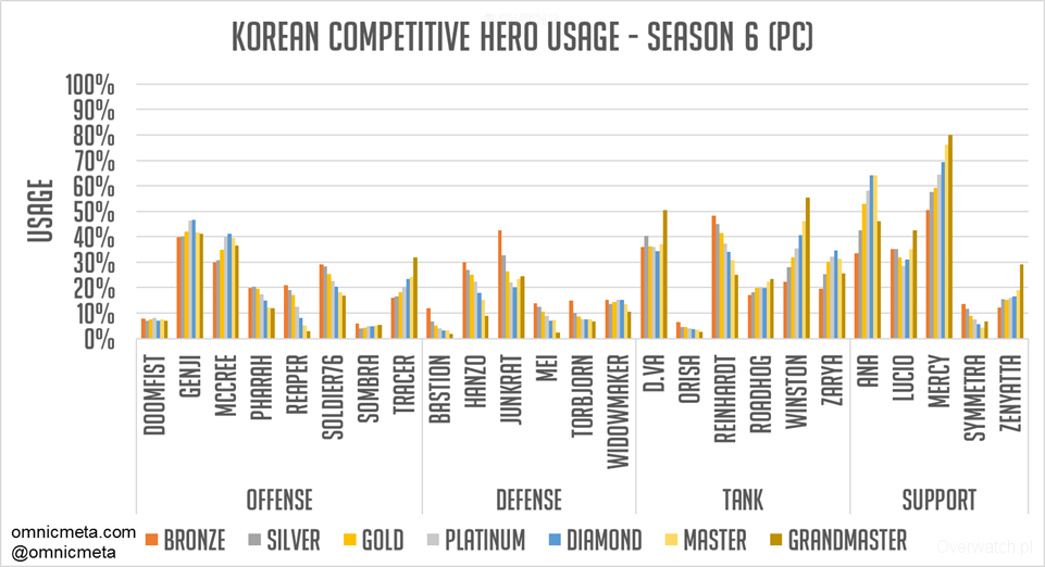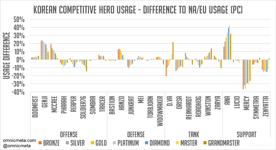 Widać ewidentnie, że o wiele częściej wybiera się w Korei Genjiego oraz McCree, jako tych głównych atakujących. Tymczasem Złomiarza na obronie spotkacie częściej na EU/NA, niżeli w Korei. Na tankach: D.Va u nas i Winston w Korei. Ewidentnie widać także, że Orisa oraz Wieprzu są bardziej popularni na EU/NA. W końcu wsparcie, gdzie Anę zobaczycie w 25% większej ilości meczów, niż u nas.
