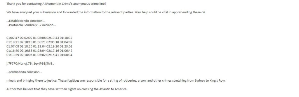 W powyższej dokumentacji znajdziemy odniesienia do strony amomentincrime.com, na której czekają nasz kolejne zagadki. Jeden z graczy wpadł na pomysł wysłania emaila na adres tips@amomentincrime.com - oto co otrzymał.