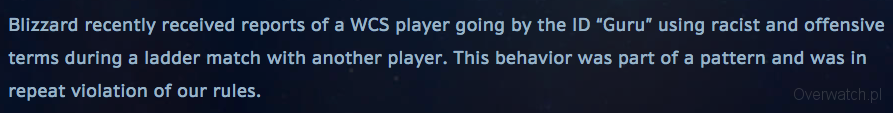 O ile poprzednio mieliśmy dość mocno dyskusyjne decyzje Blizzarda, o tyle w tym przypadku zawieszenie wydaje się uzasadnione. Tym bardziej, gdy obecnie tak wiele mówi się o możliwości wprowadzenia e-sportu na Igrzyska.