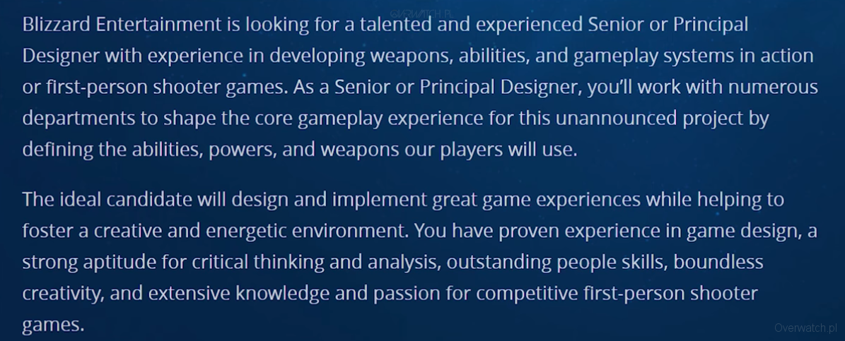 Zastanawiające jest również obserwowane ostatnio zjawisko przechodzenia pracowników Overwatch do czegoś innego. Może zauważyliście na Twitterach niebieskich, że zadziwiająco często pojawiają się wpisy typu:Dzięki za super czas w zespole Overwatch. Spokojnie, zostaje w Blizzardzie.Dziwne. Zazwyczaj przy takich sytuacjach mamy jasno określone, że dana osoba przechodzi po prostu do Heroes of the Storm, albo Hearthstone. Tutaj kompletnie nic. Potwierdza to niejako spekulacje, że rzeczywiście część zespołu zajmuje się już czymś nowym.