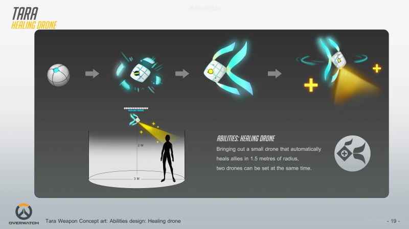 Druga umiejętność to leczący dron. Tara wysyła małego drona, który leczy sojuszników na obszarze 1.5 metra. Takich dronów można wysłać do dwóch w tym samym momencie.