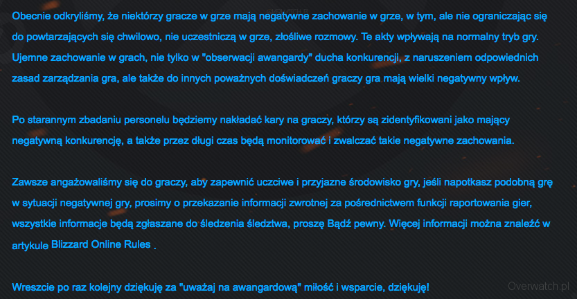 Blizzard przestał się patyczkować i bardzo dobrze.Chiński oddział Blizzarda poinformował, że zbanował kilkaset kont w Overwatch za złe zachowanie w grze, wliczając w to: obrażanie, czasową niedostępność, wyzwiska, złośliwe uwagi etc. W sumie za wszystko, co może w jakiś sposób wpływać na normalnych graczy.