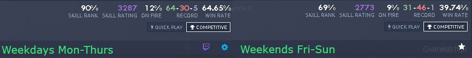 Jeden z graczy Overwatch postanowił przeprowadzić bardzo ciekawe doświadczenie.Gość o nicku ThaITGuy zrobił dwa, zupełnie nowe konta. Na jednym grał tylko w tygodniu, na drugim w weekendy. Różnica pomiędzy dniami tygodnia okazała się zadziwiająco duża.