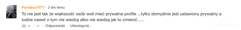 Prywatne profile sprawiają, że grając z innymi, kompletnie nie widzimy ich aktywności bohaterów. Przekładając to na ludzki język - nie wiemy, czym najczęściej grają. Wprowadzono to głównie dlatego, że wiele osób nie chciało ujawniać tych informacji i wydawało się, że nie ma to wpływu na rozgrywkę, skoro do gry wszedł system wyszukiwania ekip. Przesadziłabym pisząc, że co chwilę pojawiały się propozycje wprowadzenia możliwości nieujawniania godzin spędzonych na danych bohaterach, ale faktycznie - bywały. Dlaczego? Wiele osób uważało, że pokazywanie bycia mainem jakiejś postaci naraża na hejt. Był taki okres, kiedy mainy Hanzo i chociażby Łaski miały trochę trudniej. Ludzie jakby bardziej się irytowali na tych dwóch bohaterów. Nie jakoś strasznie, ale powstało takie niepisane prawo śmiania się z osób, grających tylko jedną postacią.Tylko nie wszyscy to popierają