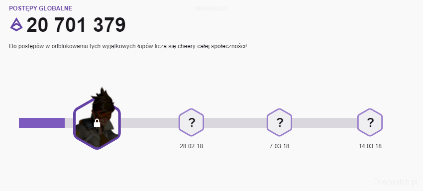 Przez pierwszą dobę udało się zebrać 11,000,00, co w przeliczeniu dało jakieś 150 tysięcy dolarów. Teraz mamy 20,701,229 co daje nam mniej więcej dwukrotność poprzedniej wartości. Przypomnijmy, że wszystko po to, by dopingować swoje ulubione drużyny w Overwatch League oraz odblokowywać kolejne, ekskluzywne przedmioty w postaci skórek i emotek. Na ten moment gracze "walczą" o skórkę do Smugi, która dostępna będzie po wbiciu 40,000,000 bitsów (dostęp do skórki zapewnia wysłanie 100 bitsów, czyli jakiś 1.72$).