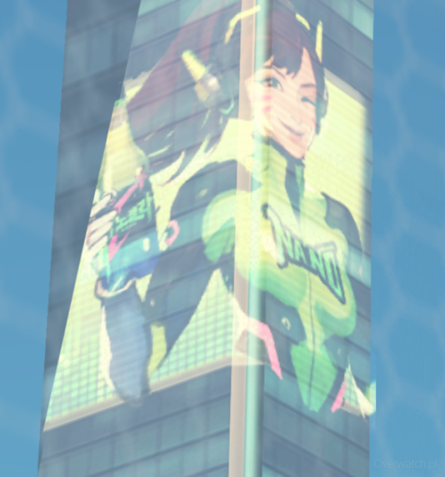 Niby zwykła D.Va, ale jednak na przybliżeniu widać, że skin różni się od tych, które obecnie mamy w grze. Oczywiście, mamy tutaj inne kolory, ale pojawia się też kucyk, inny rodzaj ubrania oraz jak wszyscy pewnie widzą - napis Nano.