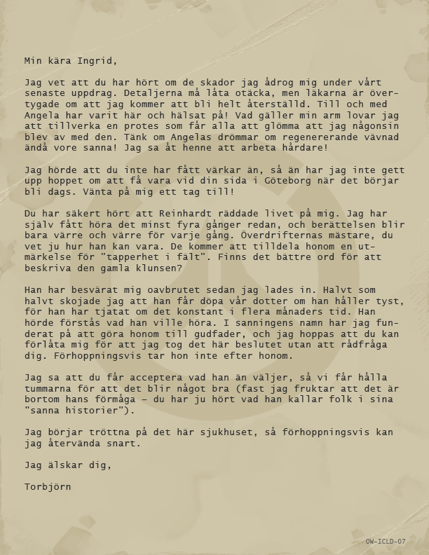 Pierwszy wpis w oficjalnych aktach Overwatch to list Torbjörna do jego żony Ingrid, napisany po wydarzeniach w Stambule. Prawdopodobnie niebawem poznamy więcej ciekawostek ze zbioru oficjalnych pamiątek po organizacji Overwatch!