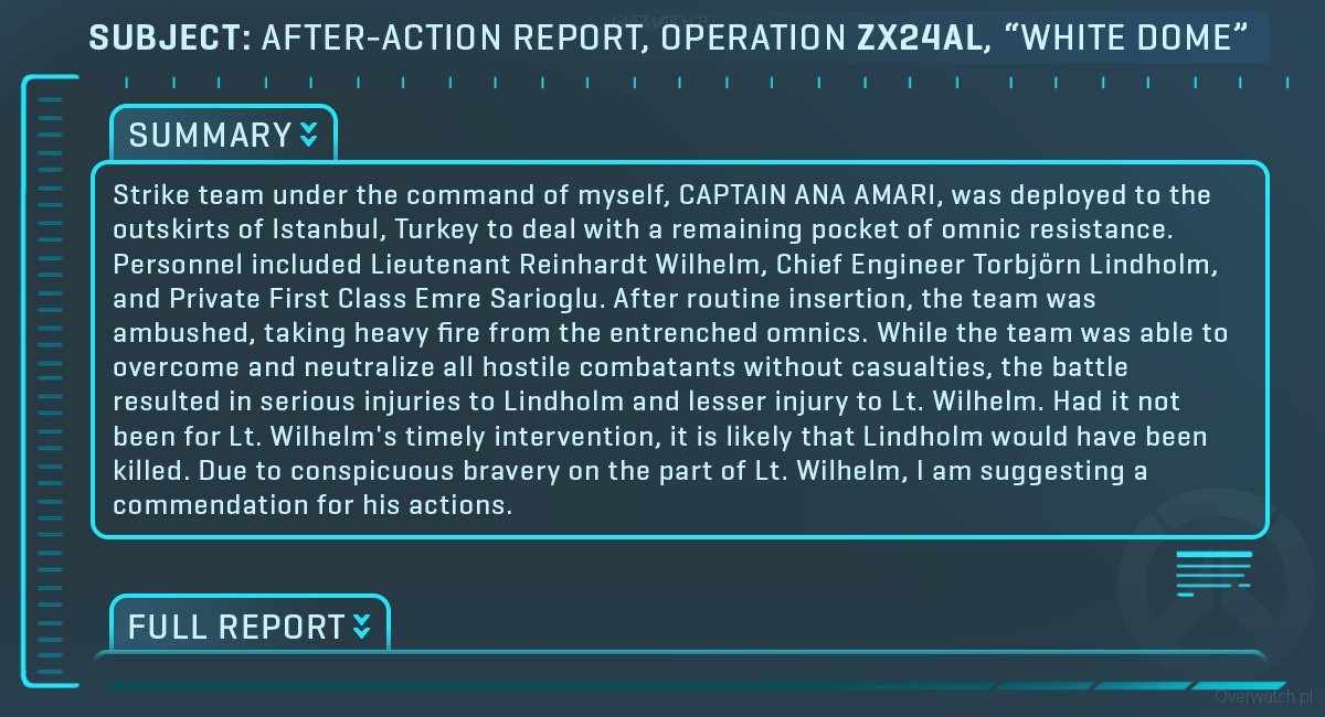 W skrócie: Grupa uderzeniowa pod dowództwem Any Amari została rozlokowana na obrzeżach Stambułu (Turcja), by uporać się z pozostałą częścią Omników. Tutaj pojawia nam się ciekawa informacja. Mamy wymienioną całą grupę, czyli Reinhardta, Torbjorna i nieznaną do tej pory postać - Emre Sarioglu. Potem wzmianka o tym, że grupa została zaatakowana, a jej członkowie odnieśli obrażenia.