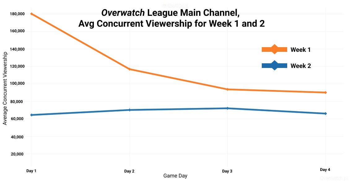 Drugi tydzień rozgrywek był znacznie gorszy pod względem oglądalności.Pierwsze godziny Overwatch League szokowały i to nawet nie przez niesamowite zagrania, a przez liczby. No, może to moje skrzywienie na punkcie cyferek, ale przyznajcie, że ilość ludzi była niesamowita. W pierwszym tygodniu przez wszystkie streamy przewinęło się około 10 milionów osób!