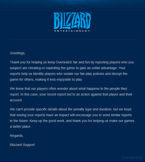 Zgodnie z tym, co zapowiadał Blizzard, teraz będziemy wiedzieć czy zgłoszony przez nas gracz został ukarany.Gdy zreportujemy kogoś w grze, to po jakimś czasie powinien nam przyjść email z informacją o tym, czy dane zgłoszenie coś dało. Całość wygląda dokładnie tak: