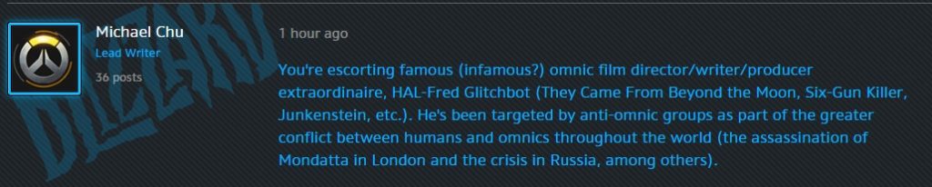 Eskortujecie znanego (nieznanego?) omnicznego dyrektora/producenta/reżysera filmowego, wspaniałego HAL-Fred Glitchbota (znanego z filmów: They Came From Beyond the Moon, Six-Gun Killer, Junkenstein, etc.). Jest on na celowniku grup anty-omnicznych, jako części większego konfliktu miedzy ludźmi I omnikami na całym świecie (miedzy innymi zabójstwo Mondatty w Londynie i kryzys omniczny w Rosji).
