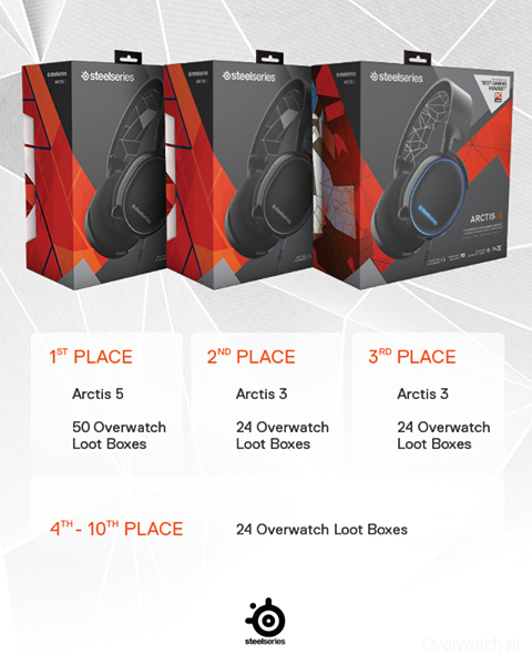 SteelSeries organizuje własny konkurs, w którym możecie wygrać świetne nagrody! Konkurs polega na wypełnianiu zadań zawartych na tej stronie. 1. miejsce – słuchawki SteelSeries Arctis 5 + 50 Overwatch Loot Boxes 2. miejsce – słuchawki SteelSeries Arctis 3 + 24 Overwatch Loot Boxes 3. miejsce – słuchawki SteelSeries Arctis 3 + 24 Overwatch Loot Boxes 4. – 10. miejsce - 24 Overwatch Loot Boxes