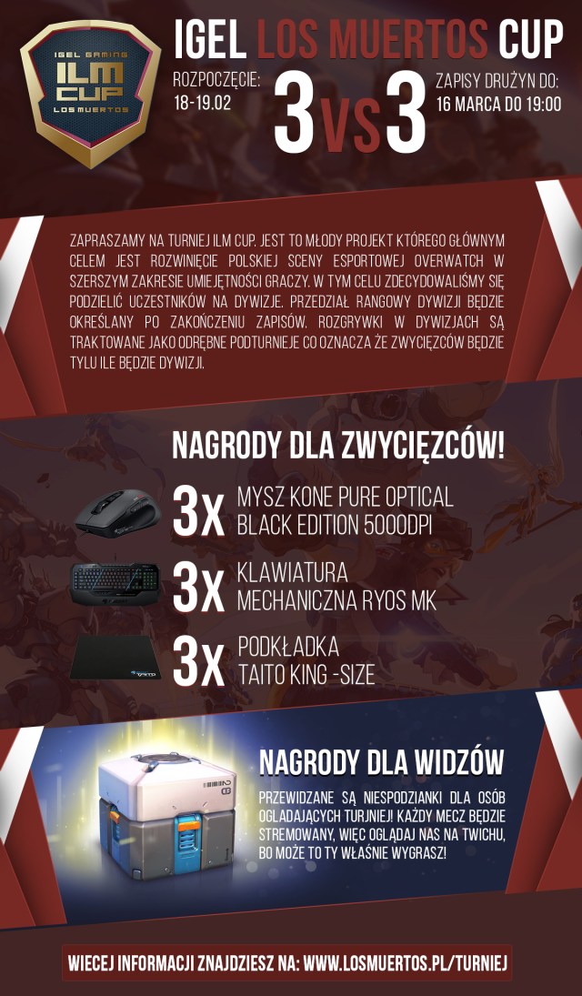 Los Muertos to dość świeży projekt, którego działania warto obserwować.Głównym zadaniem Los Muertos jest rozwinięcie polskiej sceny Overwatch. Organizowany przez nich turniej jest dość nietypowy. Wszyscy uczestnicy zostaną podzieleni na dywizje, każda dywizja będzie miała oddzielny podturniej. Czyli przekładając na normalny język, zwycięzców będzie tyle, ile dywizji. Całość ma charakter pojedynków 3v3, zapisy potrwają do 16 marca do 19:00