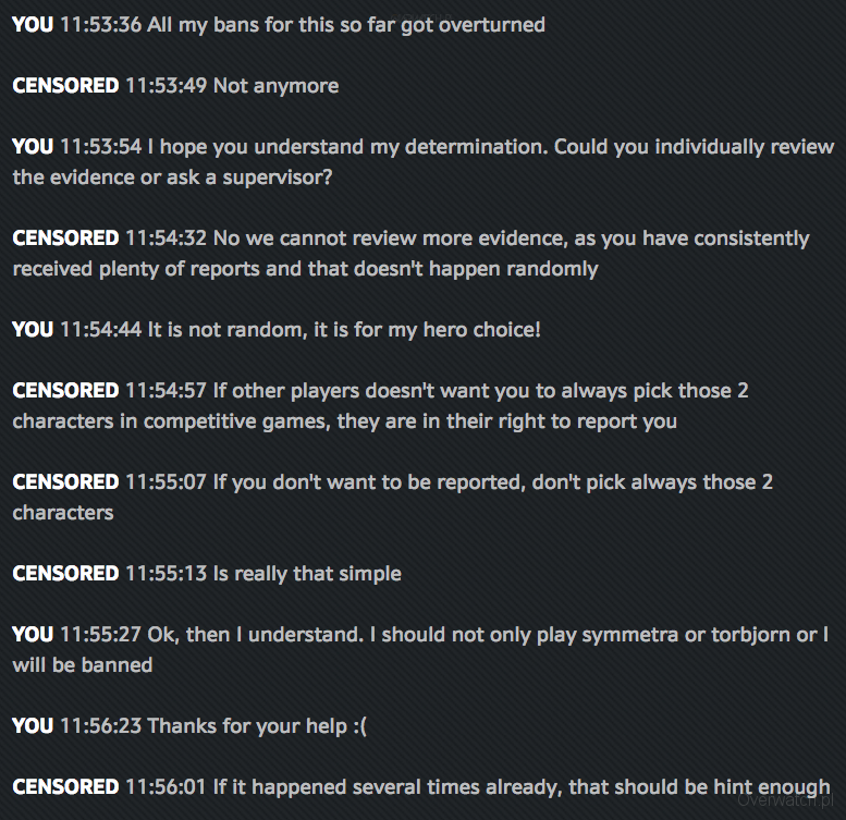Praktycznie codziennie wypływa ten sam temat i za każdym razem jest coraz śmieszniej.Chociaż słowo "śmieszniej" chyba nie jest tu odpowiednie. W każdym razie, dzisiaj kolejna osoba dostała bana za granie jedną postacią. Tym razem był to main Hanzo i okej, wszyscy rozumiemy sytuację, w której ktoś gra tylko jednym bohaterem, co notorycznie prowadzi do przegranych. Ale w tym wypadku gość był w TOP 500 i miał prawie 70% winrate! Oliwy do ognia dolewa sytuacja chyba sprzed dwóch dni, gdzie bodajże main Symmetry został zablokowany, a dział wsparcia stwierdził, że za granie jedną postacią może prowadzić do zawieszenia. Cała ta historia jest super długa i wielowątkowa, więc odeślę do oficjalnego foruma (angielski wymagany). Tutaj najważniejszy wycinek: