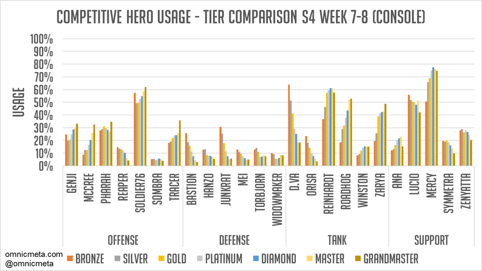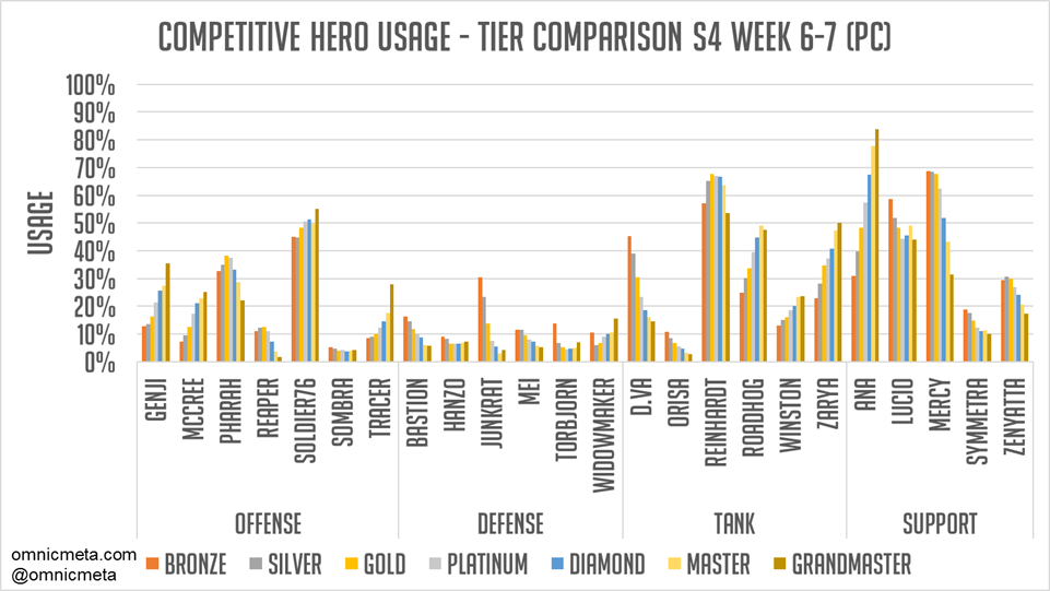 Tutaj notujemy wyraźny spadek popularności Złomiarza w brązie - ponad 10% względem poprzedniego zestawienia. Najpopularniejszy na ataku dalej jest Żołnierz. Obrona jest dość podzielona, szczególnie brązowi gracze upodobali sobie wspomnianego Złomiarza. Wśród tanków nie ma zaskoczeń - Reinhardt wygrywa zestawienie. Bohaterowie wsparcia i o pierwsze miejsce Łaska kłóci się z Aną.