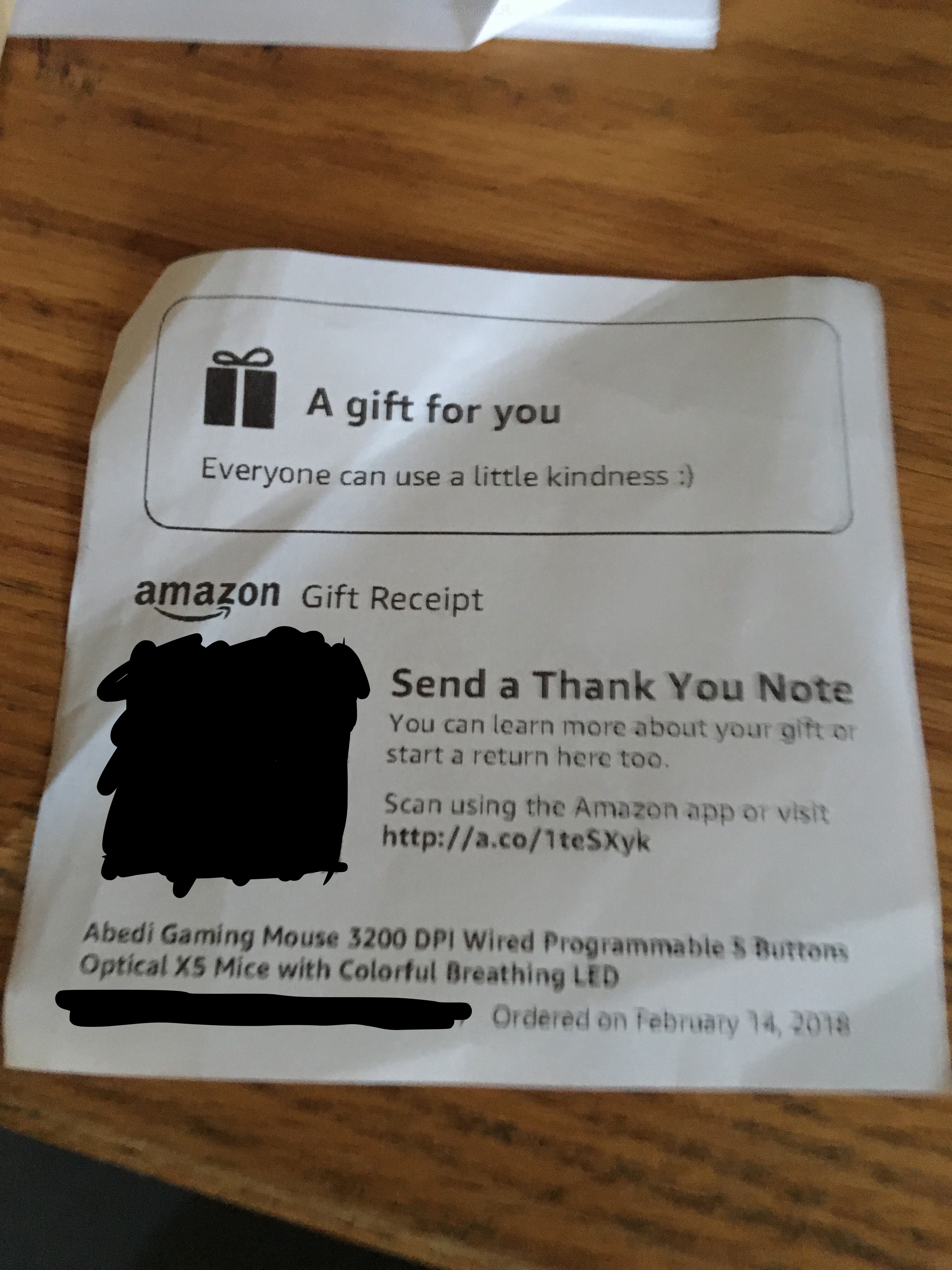 Sytuacja dość zabawna.Grałem w Walentynki w Overwatch, wszyscy w tym meczu mieli dobre humory i nagle moja myszka przestała działać. Przeprosiłem na czacie, a gracz o nicku "Kindess" (całkiem zabawne) napisał, że niedawno dostał podwyżkę i może wysłać mi nową myszkę. Byłem trochę podejrzliwy, ale ostatecznie dałem mu adres (skrytki, nie domu).Dzisiaj myszka przyszła. Nie jest to topowy model, ale nikt chyba by tego nie oczekiwał.