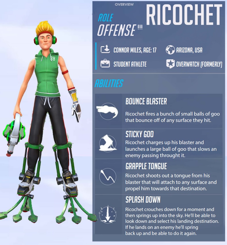 Rolą drugiej postaci jest atak. Tym razem mamy do czynienia z bohaterem, który potrafi strzelać maziowymi, odbijającymi się pociskami. Ricochet potrafi spowalniać swoich przeciwników, wypuszczać coś w rodzaju języka, który przyciąga przeciwników do wyznaczonego miejsca. Umiejętność specjalna pozwala na wystrzelenie się w powietrze, wybranie celu oraz atak, w przypadku, gdy bohater trafi przeciwnika, może odbić się drugi raz.