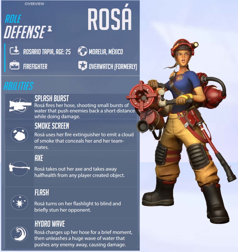 Pierwsza postać jest bohaterką, stylizowaną na strażaka. Jej rolą miałaby być obrona. Główną siłą Rosy jest oczywiście woda. Umiejętności są bardzo ciekawe i mogłyby namieszać trochę w Overwatchu.