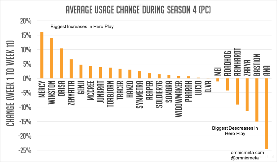 Rozpoczęliśmy kolejny sezon zmagań w Overwatch. Jak to wszystko zmieniało się na rankedach w sezonie czwartym?Omnicmeta przygotowało fajne zestawienie, pokazujące wzrosty oraz spadki popularności bohaterów Overwatch. Zacznijmy od wzrostów!