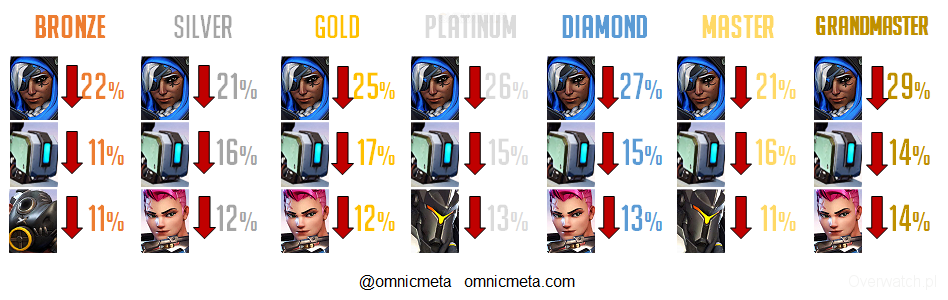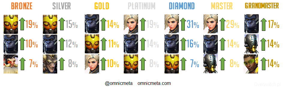 Jeszcze przed wejściem Orisy na normalne serwery, bardzo dużo osób obstawiało, że ta bohaterka z powodzeniem zastąpi Reinhardta. Ostatecznie tak się nie stało, chociaż i tak jest całkiem popularna, szczególnie na niskich rangach. Ostatnie jej zmiany spowodowały całkiem widoczny wzrost częstotliwości wybierania.Winston w górę, razem z Zenkiem