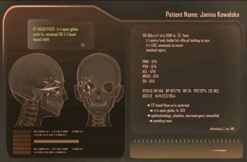 Jest to zrzut z ekranu szpitalnego przedstawiający stan zdrowia Any Amari po potyczce z Amelie Lacroix (Trupia Wdowa).