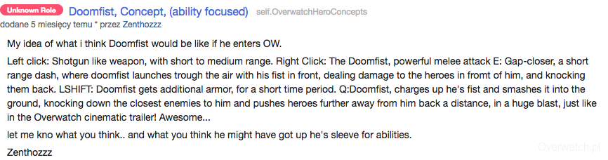 Przecieki przeciekami, ale to?Mieliśmy już kilka przecieków na 4chanie i w innych miejscach w sieci, które się sprawdziły. Wygląda na to, że to był kolejny, który wszystkim umknął. Pięć miesięcy temu ktoś na reddicie stworzył temat, w którym dość dokładnie opisał umiejętności Doomfista. Teoretycznie jest to koncept, ale za dużo rzeczy się tu zgadza.