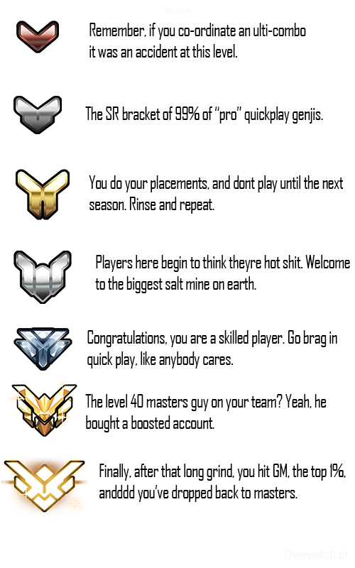 Oczywiście, że pod względem poziomu skilla to brąz jest najgorszy. Co do tego nie ma wątpliwości. Jednak jestem przekonany, że są osoby, którym tam jest dobrze i świetnie się bawią. Dzisiaj zrobiłem trochę reserachu i natrafiłem na ciekawą grafikę, która zadziwiająco dobrze oddaje "klimat" wszystkich rang.