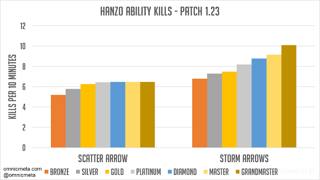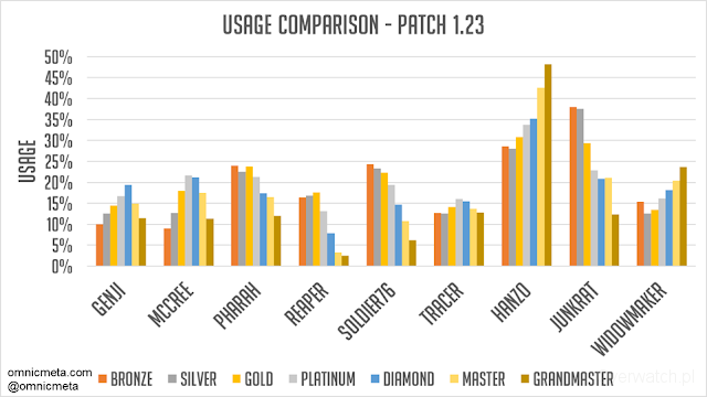 Wybieralność Hanzo, jego użyteczność, procent wygranych gier, praktycznie wszystkie statystyki postaci poszły mocno w górę. Wystarczy popatrzeć na dostarczony przez omnicmeta raport i zestawić go z poprzednim.23 marzec GrandMaster - 7%