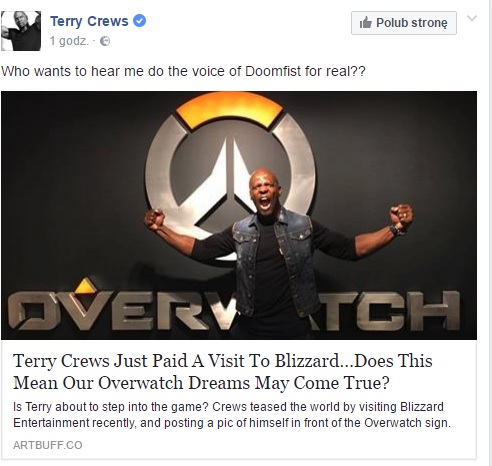 Terry Crews coraz chętniej wspomina o współpracy z Blizzardem.Najpierw Terry odpowiedział na pytanie społeczności, odnośnie tego czy chciałby zagrać Doomfista. Potem mieliśmy jego wizytę w siedzibie Blizzarda. Teraz sprawa powraca a nowy bohater praktycznie wisi w powietrzu. Terry Crews znany jest z takich filmów, jak Agenci bardzo specjalni, Terminator czy Niezniszczalni. Na swoim oficjalnym kanale Facebook zapytał społeczności, czy naprawdę chcieliby usłyszeć go w Overwatchu.