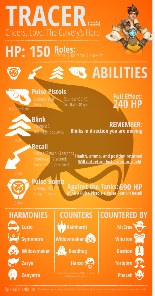 Tracer jest chyba najbardziej rozpoznawalną bohaterką w Overwatch, można rzec że jest twarzą gry. Rok temu w głosowaniu zajęła pierwsze miejsce, czy to kogoś dziwi? Jak każda postać, bohaterka posiada zarówno mocne strony jak i wiele słabych, które niekoniecznie sprawiają, że się ją prosto gra. Tracer czyli Smuga ma być szybka, jej zadaniem jest pojawienie się obicie/dobicie wroga i ucieknięcie. Spytacie dlaczego nie zabicie? Bohaterka nie ma jakiś kosmicznych obrażeń, dlatego aby udawało się nam cokolwiek zrobić, trzeba niezwykle precyzyjnie trafiać we wroga, wymaga to wiele wprawy i doświadczenia w grze w FPSy, a i tak ze swojej broni nie zadaje kosmicznych obrażeń. Pistolety pulsacyjne posiadają 40 pocisków, z czego każdy zadaje po 6 obrażeń, czyli maksymalnie może zabrać 240 HP. Mała ilość bazowego zdrowia sprawia, że od większości silniejszych bohaterów dość szybko umiera. Jej największym atutem jest mobilność, to właśnie dzięki jej się tak nazywa. Umiejętność kryjąca się pod przyciskiem Shift - Mignięcie daje możliwość pokonania pewnej odległości w bardzo krótkim czasie, umiejętność ta jest idealna do uciekania, zaskakiwania wroga, a także przeskakiwania między budynkami o czym wspomniano w poniższym filmie. https://www.youtube.com/watch?v=-4wuU_hApBw Kolejną umiejętnością jest E, czyli cofnięcie się do miejsca, w którym była 3 sekundy temu. Super zdolnością bohaterki jest Bomba Pulsacyjna. Przykleja się ona do powierzchni na której wyląduje, a także do przeciwników, zadaje przy tym 450 obrażeń, a to na prawdę sporo. Osoba o nicku Maxfield przygotowała info-grafike prezentującą jej umiejętności, a także postacie kontrujące.