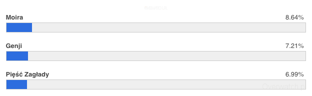 Pierwsza trójka to kolejno Moira, Genji i Doomfist (nowy redaktor, sorry za polską wersję). Widać ewidentnie, że społeczność czeka i to bardzo mocno na nową zawartość do Moiry. Nic dziwnego, bohaterka jest naprawdę kozacką osobowością i sam jestem ciekawy, co Blizzard przygotuje. Genji to pewien standard w tych głosowaniach, często widać go gdzieś na samej górze. Ciekawy natomiast jest tutaj widok Doomfista, który chyba powoli wraca do gry po tych wszystkich błędach i problemach.