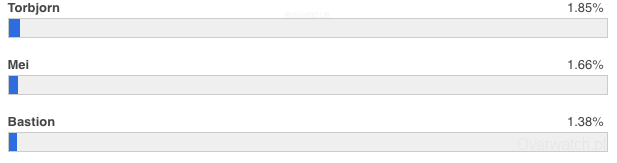 Torbjorn, Mei i Bastion. Czyli obecnie najmniej popularne postacie, jeżeli chodzi o Overwatch. Mei niedługo otrzyma zmiany, więc pewnie ten wskaźnik poleciałby do góry. Z Torbjornem to już tak jest, ma swoich fanów, którzy zawsze będą za nim stali, podobnie jest z Bastionem.