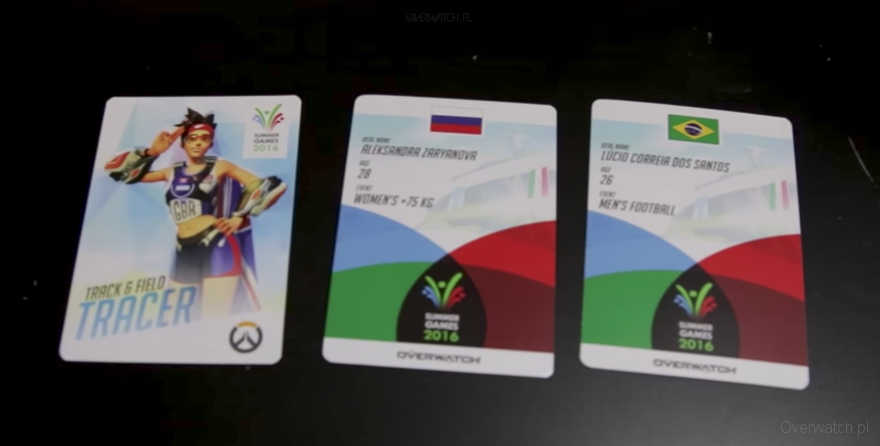 Dopiero dalej robiło się bardziej interesująco. W skrzynce znajdowały się trzy karty z wizerunkami bohaterów OW. Na odwrocie mieliśmy wypisane imię i nazwisko, wiek i dyscyplinę.