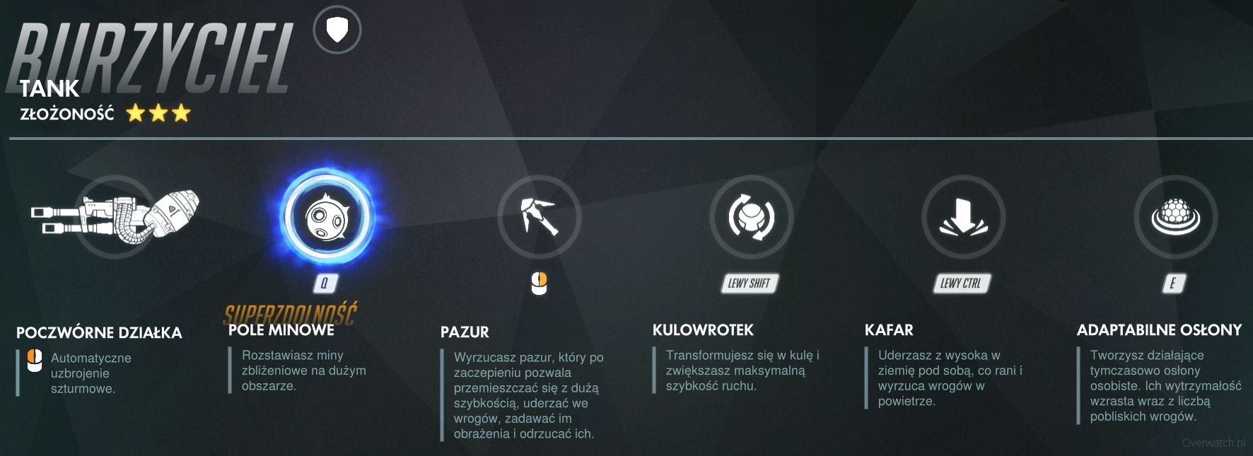 Zdolności mechaniczne Burzyciela i jego opancerzony mech czynią z niego groźnego tanka, który może przetaczać się przez pierwsze linie wrogów i robić zadymę na tyłach. Jego podstawowym uzbrojeniem są Poczwórne Działka, dwa zestawy sprzężonych karabinów maszynowych, które rozdzierają na strzępy wrogów znajdujących się na celowniku. Burzyciel nie boi się ataku na żadną drużynę dzięki Adaptabilnym Osłonom, które są tym wytrzymalsze, im więcej wrogów znajduje się w pobliżu i czynią go niezwykle trudnym do zabicia, kiedy wtacza się w sam środek walki. Osłony pozwalają mu też bezpiecznie się wycofać z groźnych sytuacji. Zdolność Kulowrotek powoduje, że Burzyciel chowa mechaniczne odnóża mecha i transformuje się w kulę, co zapewnia większą szybkość maksymalną. Kiedy Hammond korzysta z Pazura, na drodze nie stanie mu żadna przeszkoda – ta zdolność krótkiego zasięgu pozwala chwytać się otoczenia, huśtać po mapie i uderzać we wrogów. Pazur pozwala Burzycielowi osiągnąć również maksymalną prędkość i taranować wrogów, aby zadawać im ogromne obrażenia i odrzucać ich. Kiedy mech jest w powietrzu, Hammond może użyć zdolności Kafar, która powoduje, że spada on prosto na wrogów.