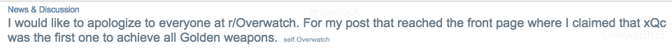 Kilka dni temu świat obiegła informacja odnośnie tego, że xQc stał się pierwszym graczem, który zdołał odblokować wszystkie złote bronie w Overwatch.Kilka dni temu na reddicie pojawił się wpis informujący o tym, że xQc jako pierwszy gracz na świecie odblokował wszystkie dostępne aktualnie złote bronie. Post był bardzo popularny i zarówno wiele osób, jak i serwisów o tym mówiło. My o tym jednak nie pisaliśmy i mieliśmy ważny powód - to nieprawda. Faktycznie, xQc odblokował wszystkie złote bronie, ale zdecydowanie nie był w tym pierwszy. Pisaliście nam sporo wiadomości w komentarzach o tym i jak widać, dalej panuje mylne przekonanie.