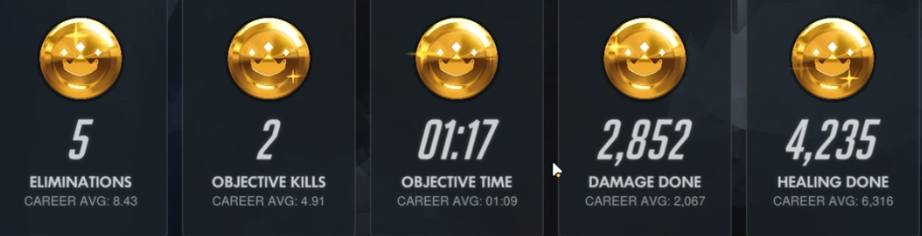 Dla osób, które nie bardzo rozumieją system medali w Overwatch (uwierzcie, że mamy masę nowych graczy na stronie) - im lepsze wyniki w danej sekcji (Eliminacje/Zabici przy celu/Czas przy celu/Wyleczone obrażenia), tym lepszy medal. Złoto jest oczywiście najlepszym wynikiem.Trochę ciekawiej